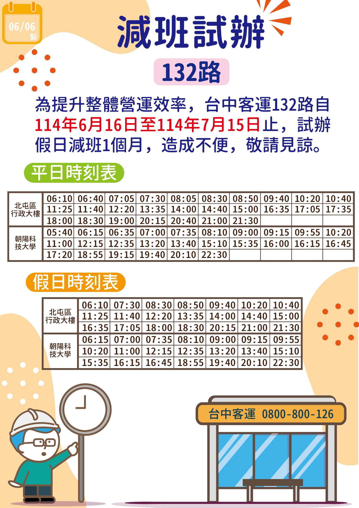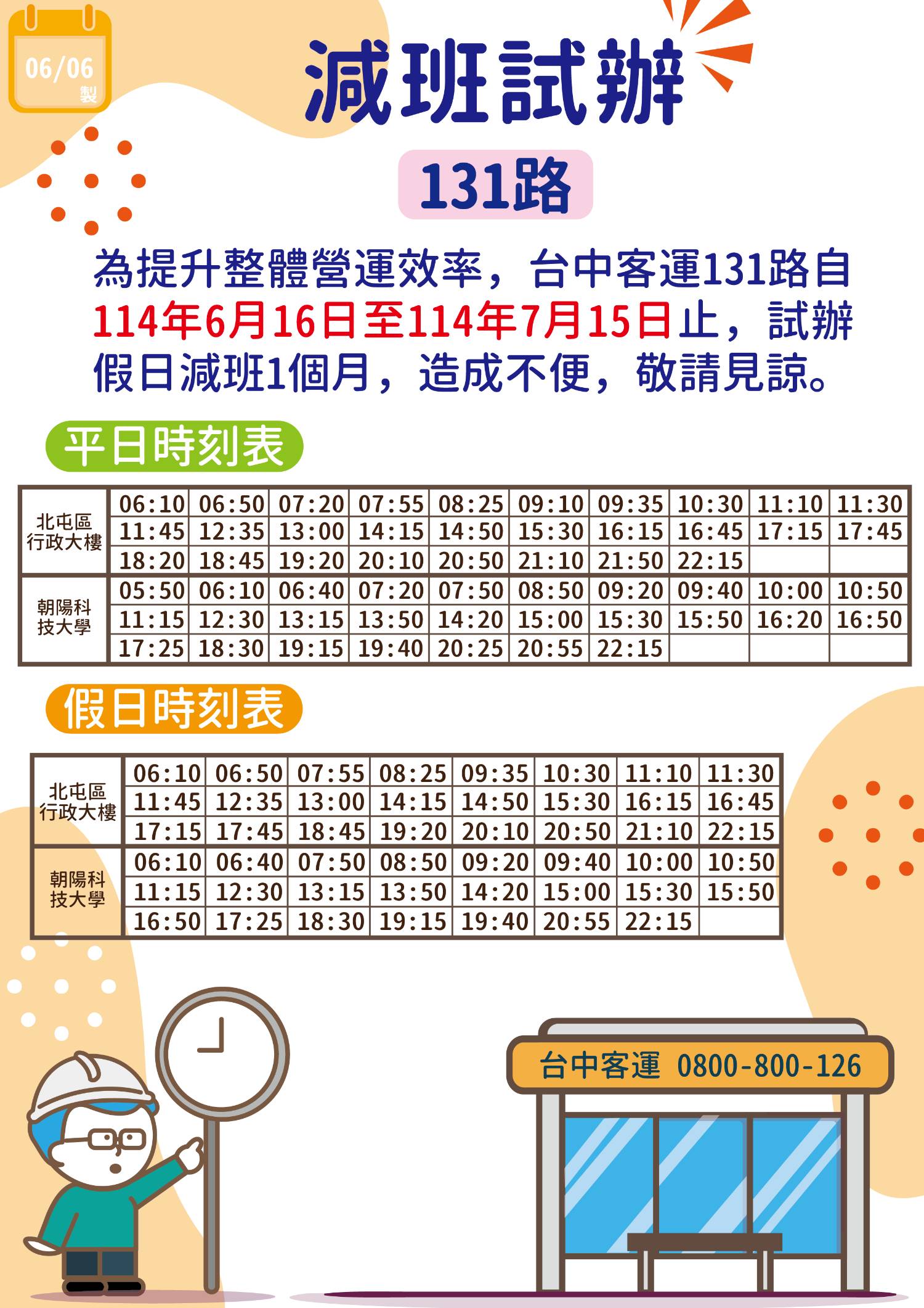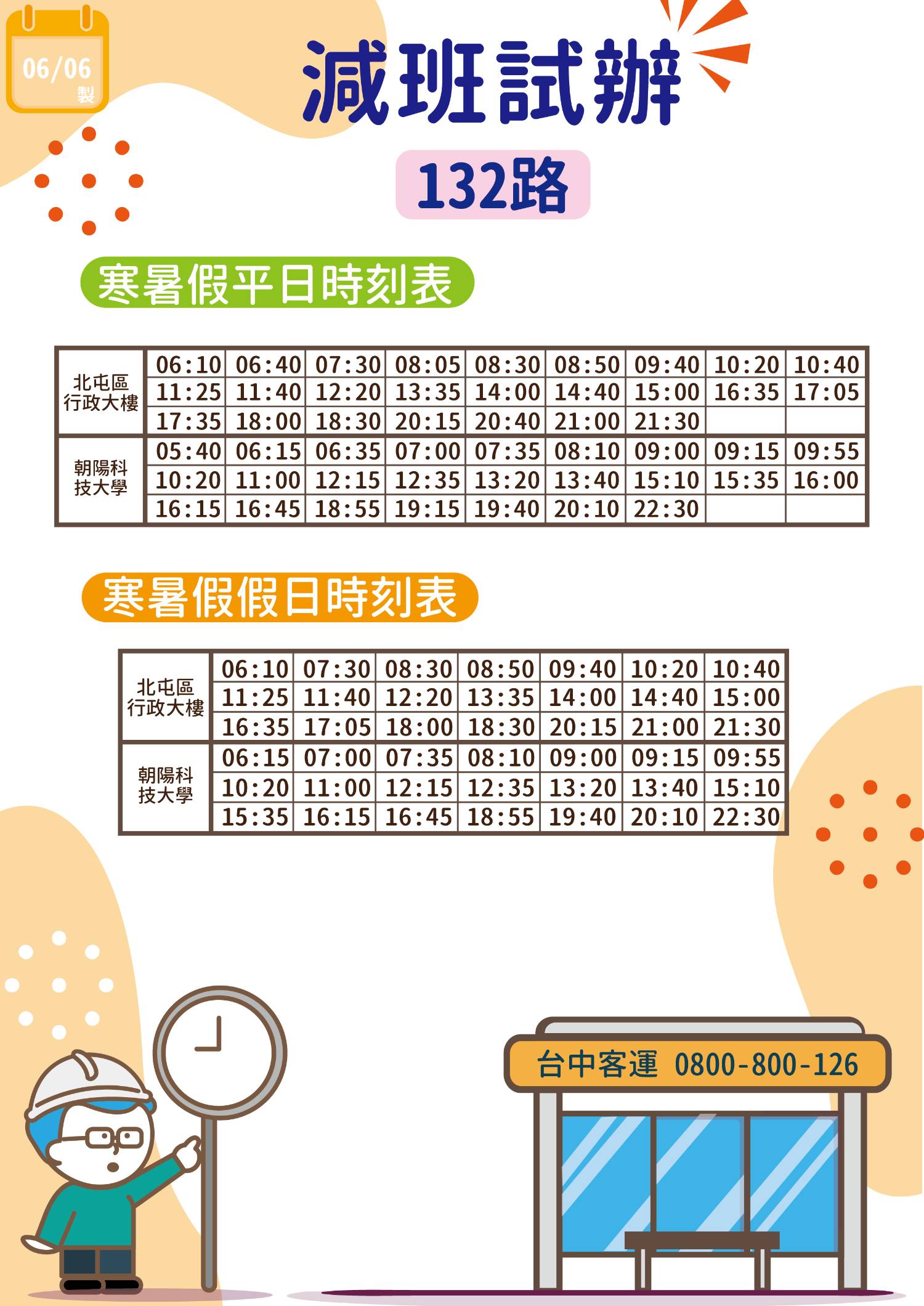 營運路線 臺中市公車 131 北屯區行政大樓-朝陽科技大學 臺中市公車 132 北屯區行政大樓-朝陽科技大學 營運業者 台中客運 實施日期 2025.06.16 詳細時刻 紅底班次 為132班次,經塗城路 其餘班次 為131班次,經吉峰路 平常日 北屯區行政大樓 朝陽科技大學 05 - 05 40 50 06 10 10 40 50 06 10 15 35 40 07 05 20 30 55 07 00 20 35 50 08 05 25 30 50 08 10 50 09 10 35 40 09 00 15 20 40 55 10 20 30 40 10 00 20 50 11 10 25 30 40 45 11 00 15 12 20 35 12 15 30 35 13 00 35 13 15 20 40 50 14 00 15 40 50 14 20 15 00 30 15 00 10 30 35 50 16 15 35 45 16 00 15 20 45 50 17 05 15 35 45 17 20 25 18 00 20 30 45 18 30 55 19 00 20 19 15 15 40 40 20 10 15 40 50 20 10 25 55 21 00 10 30 50 21 - 22 15 22 15 30 寒暑假平常日 北屯區行政大樓 朝陽科技大學 05 - 05 40 50 06 10 10 40 50 06 10 15 35 40 07 20 30 55 07 00 20 35 50 08 05 25 30 50 08 10 50 09 10 35 40 09 00 15 20 40 55 10 20 30 40 10 00 20 50 11 10 25 30 40 45 11 00 15 12 20 35 12 15 30 35 13 00 35 13 15 20 40 50 14 00 15 40 50 14 20 15 00 30 15 00 15 30 35 50 16 15 35 45 16 00 15 20 45 50 17 05 15 35 45 17 25 18 00 20 30 45 18 30 55 19 20 19 15 15 40 40 20 10 15 40 50 20 10 25 55 21 00 10 30 50 21 - 22 15 22 15 30 例假日 北屯區行政大樓 朝陽科技大學 06 10 10 50 06 10 15 40 07 30 55 07 00 35 50 08 25 30 50 08 10 50 09 35 40 09 00 15 20 40 55 10 20 30 40 10 00 20 50 11 10 25 30 40 45 11 00 15 12 20 35 12 15 30 35 13 00 35 13 15 20 40 50 14 00 15 40 50 14 20 15 00 30 15 00 10 30 35 50 16 15 35 45 16 15 45 50 17 05 15 45 17 25 18 00 30 45 18 30 55 19 20 19 15 40 40 20 10 15 50 20 10 55 21 00 10 30 21 - 22 15 22 15 30 異動內容 調整班次 131 例假日 北屯區行政大樓 減開18:20/21:50班次 朝陽科技大學 減開16:20/20:25班次 132 例假日 北屯區行政大樓 減開17:35/20:40班次 朝陽科技大學 減開16:00/19:15班次 -- ※ 發信站: 批踢踢實業坊(ptt.cc), 來自: 140.113.160.39 (臺灣) ※ 文章網址: https://www.ptt.cc/bbs/BusTimes/M.1749469502.A.977.html ※ 編輯: Jason520395 (140.113.160.39 臺灣), 06/09/2025 19:47:25