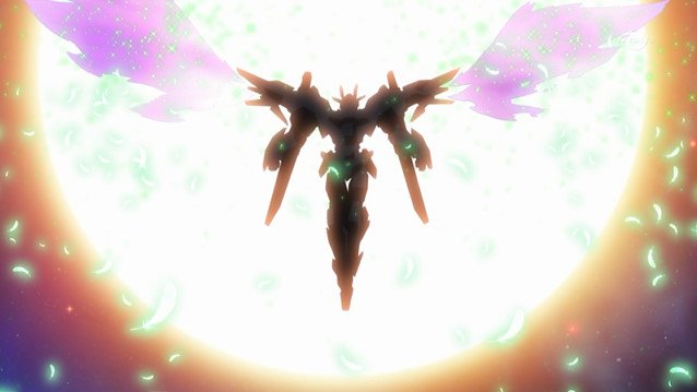 小陸伸手摸00傷痕後,冒出了GN粒子進入意識空間,撇見了新機體的形象