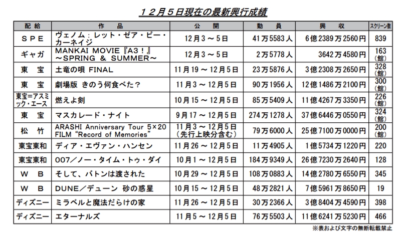 ║1║-║ヴェノム:レット.ゼア.ビー.カーネイジ ║1║ 4.5億║ 6.2億║