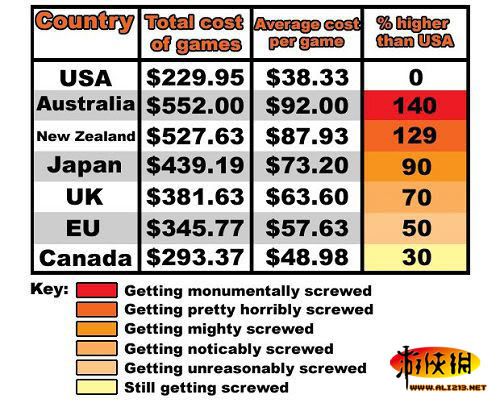 以下是IGN澳大利亞所制作的一張圖,他們比較了六個國家遊戲價格和美國的差距。
