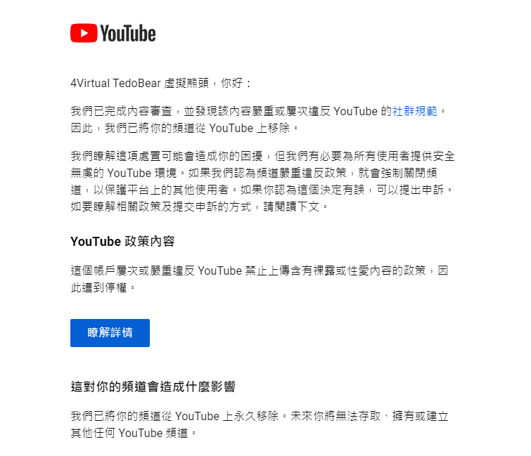 推 zxcvbnm00316: YT只會ban版權 %%台都不管 == 03/06 21:11