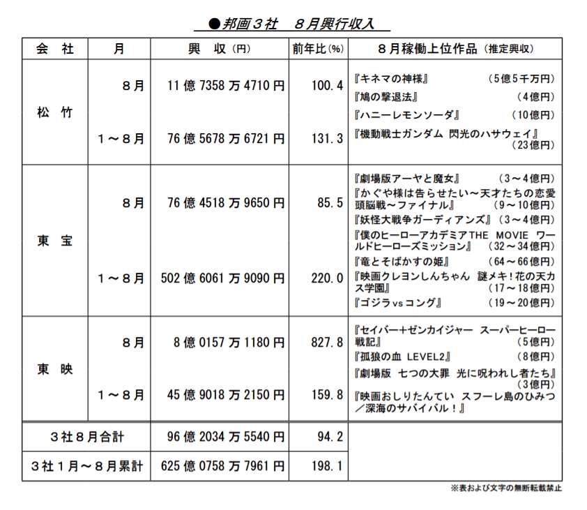 日本三大電影發行公司於2021年08月及01至08月的收入比較: