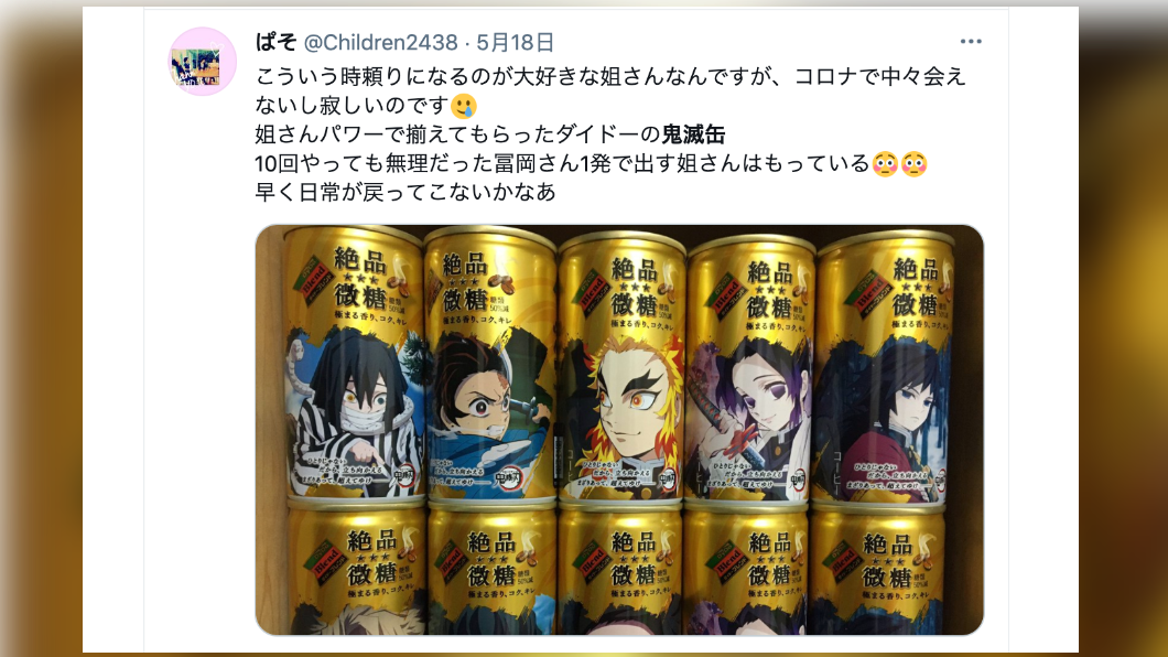 月才開賣的鬼滅罐,在短短4個月內就創下熱銷1億瓶的佳績。許多日本網友也紛紛在個人