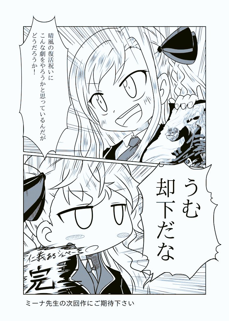 <第一格> 咪醬:為了慶祝晴風號的復活,我創作了一個話劇想要來演出,如何? <第二格> 緹亞:UMU,退回 <有仁義的施佩 完> ...咪醬你只是想跟幸子一起演戲吧XDD 最後是粉絲賀圖 自信的小櫻(頭像)