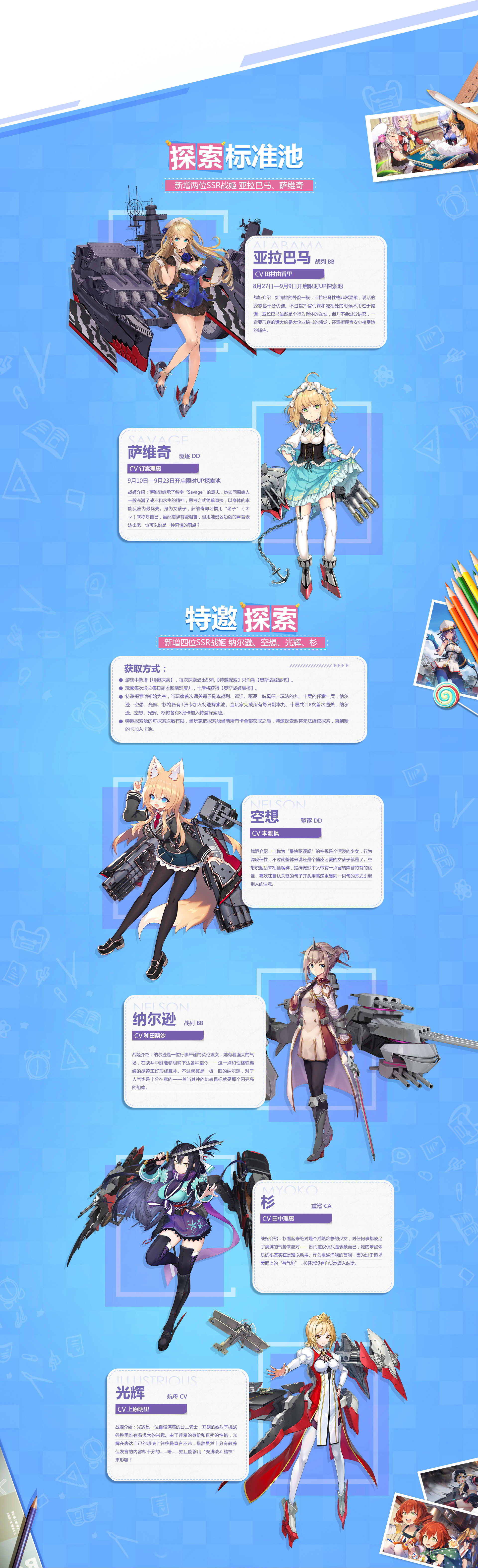) 由中國北京巴別時代製作及發行的艦娘遊戲《蒼藍誓約》,於8/27~9/23舉辦開學祭, 活動將實裝六艘新船、四艘既有艦艇的新外觀。 ◎新船情報 1.美國主力艦─阿拉巴馬(配音:田村由香里)