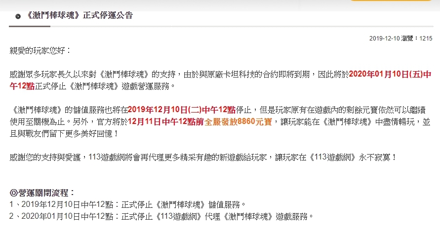 中午 12 時停止《激鬥棒球魂》遊戲營運服務,而遊戲儲值服務從即日起停止。