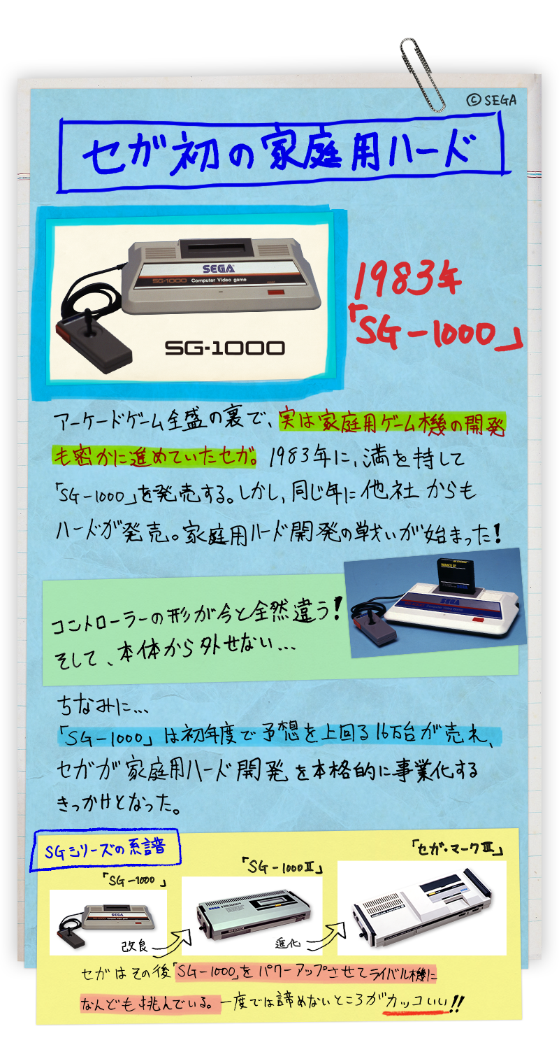 以大型電玩遊戲機台為主力的 SEGA,於 1983 年正式進軍家用遊戲市場,推出首款家