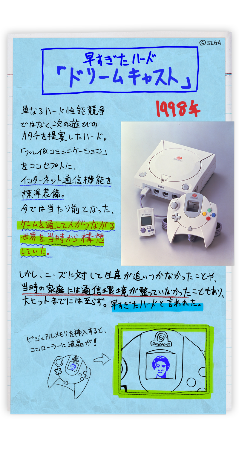 「Saturn」,1998 年推出末代主機「Dreamcast」,2001 年退出主機市場。