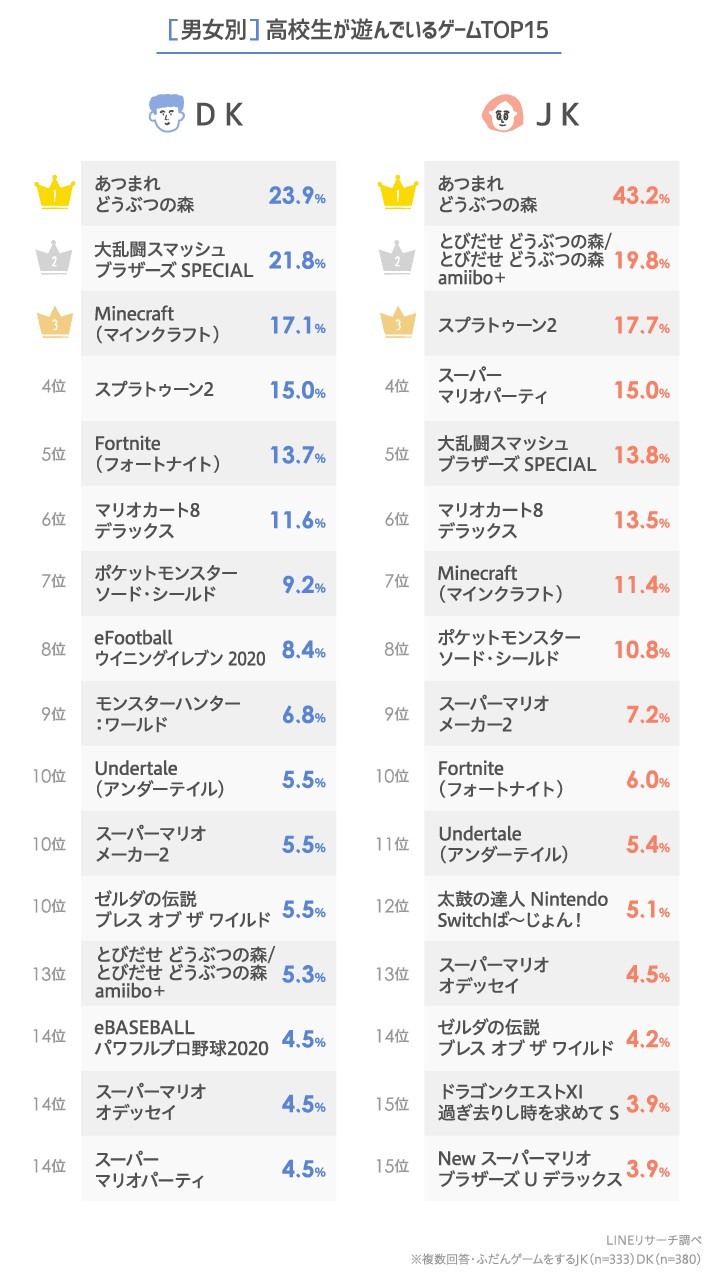 第一名都是動森,只是男生部份是23.9%+5.3%(前作),女生部份是43.2%+19.8%(前作)