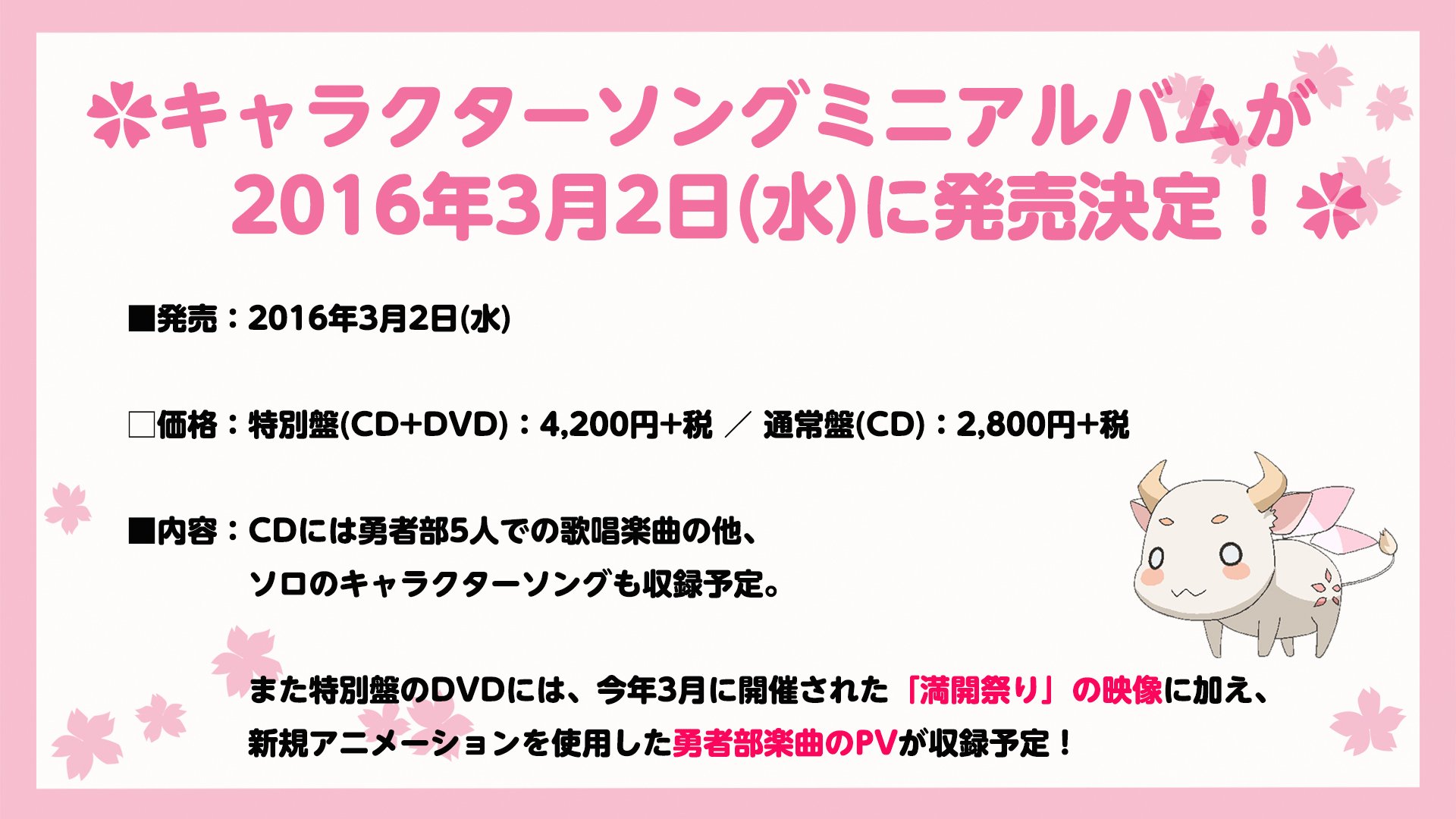 角色歌曲Mini Album 2016年3月2日發售決定