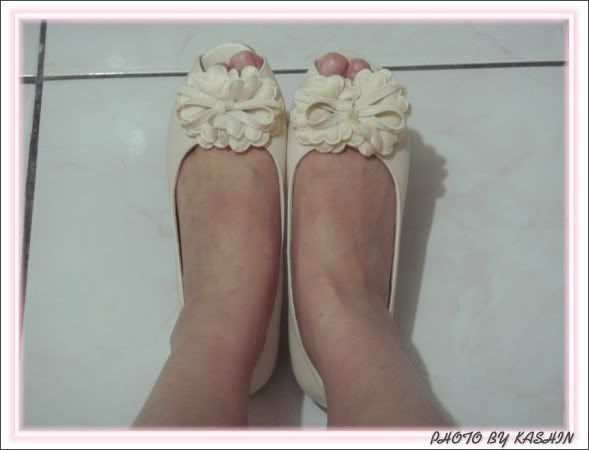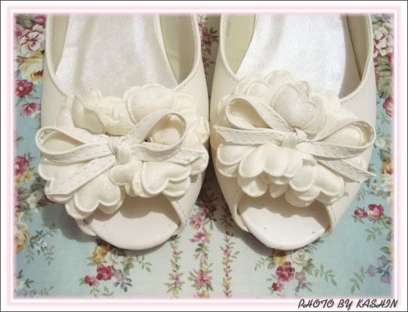 超可愛的米色蝴蝶結魚口平底鞋