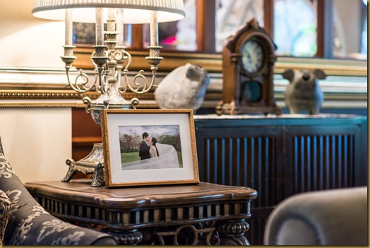 一樓的沙發邊桌,一樣用小尺寸的婚紗照佈置,金色相框很融入場景。