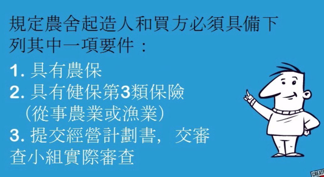類保險(從事農漁業)」、「提交經營企劃書供審查」其中一個條件,才能購