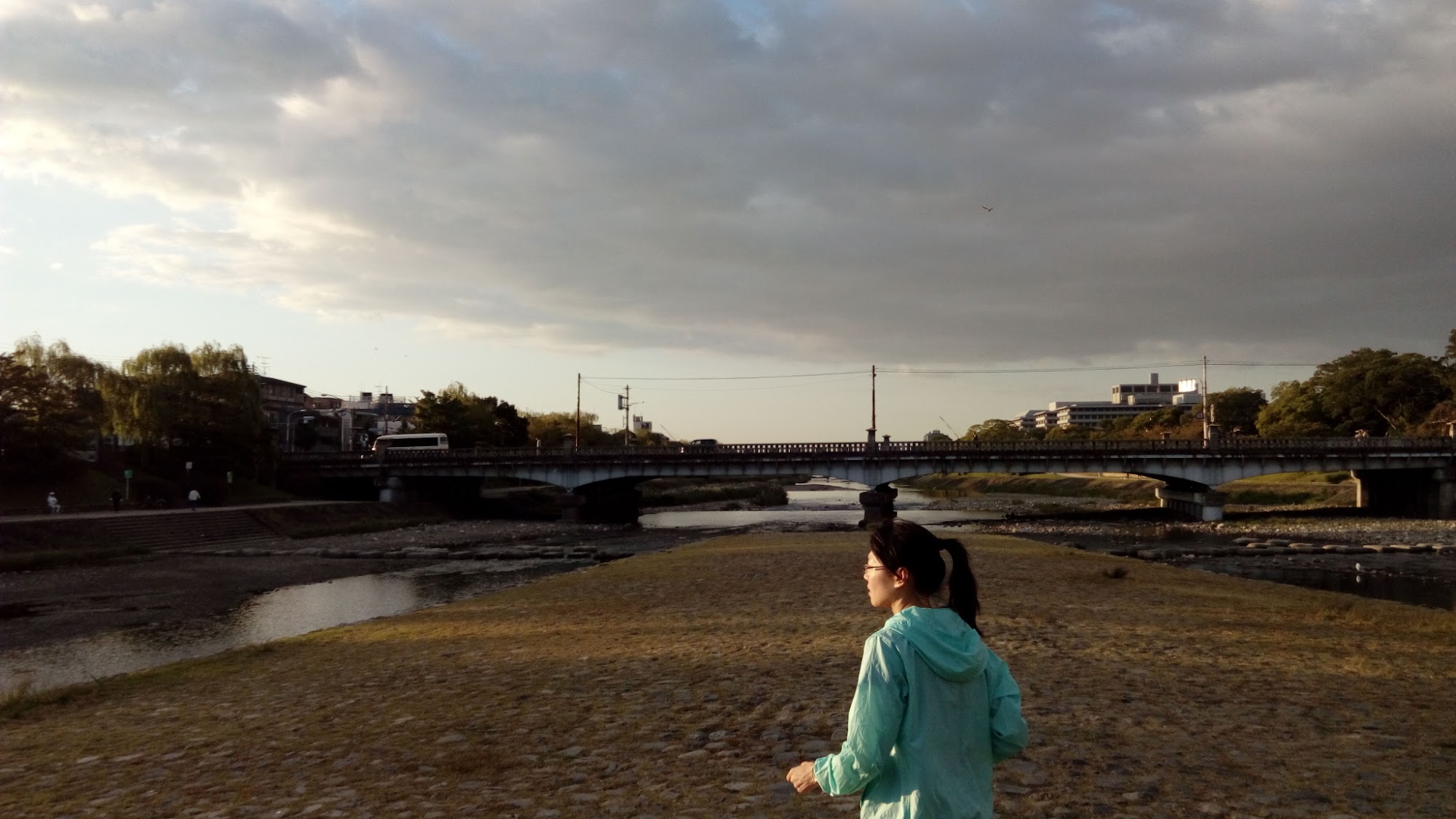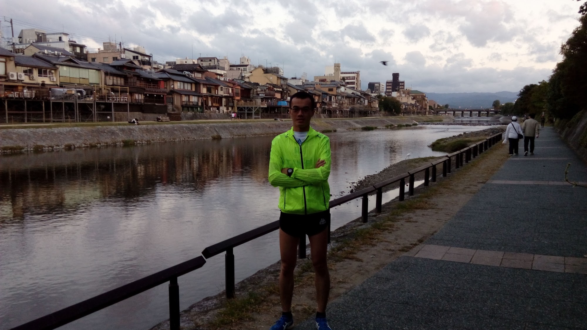 我們住在四條附近,因此直接走過四條大橋後下河堤暖身,從鴨川的左岸(東岸)起跑,