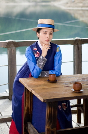 樂於接受新鮮事物的柳石蘭戴了一頂禮貌,帽子中的藍條與韓服色彩一致,別具一格。