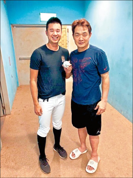 黃子鵬(左)日前終於和偶像彭政閔合照,也要到簽名球,圓了他等了13年的夢想。(取