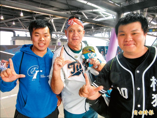 台灣球迷Ryan(左)、Tayo(右),和猿隊死忠美國球迷RJ大叔。(記者林宥辰攝)