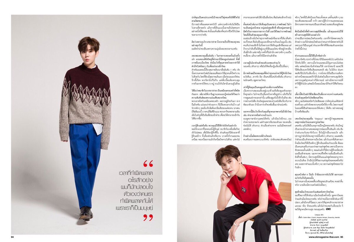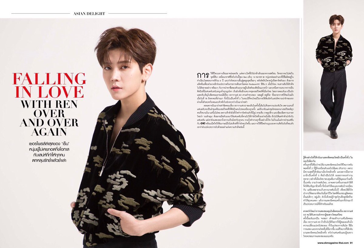 FALLING IN LOVE WITH REN OVER AND OVER AGAIN 來自Ren的最新驚喜,讓你無數次陷入愛情的魅力   過著普通的生活可能意味著安全,但是只要你不走出自己的舒適圈,就難以追求夢想 。就像是NU'EST W Ren的生活一樣。作為6年次的KPOP偶像,他的人生在再次開始後不斷 攀升。去年他和隊友們參與了生存秀Produce 101第二季,幫助組合獲得高人氣,也實現 了自己的夢想。除了作為偶像,Ren客串LoeyDooDee旗下的情境喜劇Coffee Society4.0, 為粉絲帶來驚喜。這集電視劇於8月18日播出,也是我們今年第二次感受到他惹人喜愛的 性格。   這次拍攝中充滿了Ren讓人印象深刻的故事。比起粉絲準備驚喜,Ren穿著泰國傳統服 飾出現在機場,此外他還準備了印有自己手繪的大象和手寫的泰語「我愛你」的卡片,親 手發給等待他的粉絲。不只是粉絲,Ren對每個人都非常友好,他做任何事都全力以赴, 包括本次OK!雜誌的拍攝採訪,並透露了後續的項目和他關於成功的觀點。 第二次在泰國拍攝情境喜劇感覺如何? 第一次聽到我將要拍攝的時候非常開心,第二次在得到拍攝的消息讓我感覺如在天堂。再 次來到泰國讓我非常高興,我還想再來,如果可能,我想在泰國做更多的事,希望可以再 次獲得邀請。可能是因為我上次做得不錯,所以他們再次選擇了我,這讓我感到壓力,因 為我需要保證自己可以完成他們的期待。幸運的是我從小就喜歡看情境喜劇,所以我知道 哪些部份需要保證有趣。 請問你是否期待自己這次在情境劇中的亮相可以獲得更多泰國人的關注? 我扮演了一位咖啡店店主名叫鍾錫。我希望他們可以注意到我的進步和提升,我很高興可 以再次參演泰國情境喜劇,希望粉絲和泰國觀眾喜歡我的表演。 除了情境劇,你似乎還有另一個即將到來的項目? 這是一個泰國和美國公司的合作項目。所有演員都很有名,明年將會有官宣,這是我被允 許透露的訊息。請多多期待。 我們聽說是一部鬼片,請問你害怕嗎? 我特別害怕鬼(大笑),真實的驚恐在拍攝中好像略有幫助。我喜歡看恐怖電影,如果我開 始看,一定會看完。但我絕不獨自看,絕不!每次我至少要找一位成員或者朋友陪我看, 他可以在觀看途中睡著,只需要在我身邊就好。 去年好像發生了很多事情,包括好的時光。哪件事讓你印象最深刻? 誠實地說,我記得人生中發生的每一件事。我們在韓國的第一次粉絲見面會讓我記憶猶新 ,因為那是一個很大型的活動。在泰國的演唱會和情境劇拍攝也是。 在演藝圈這麼多年對你有什麼影響? 我每年都會遇到能夠改變我的想法的人或事。我還小的時候,如果行程很多,我會覺得超 類而且很難控制自己的情緒,但隨著年齡的增長,這種想法就不再有了,我喜歡像這樣工 作,變成熟了很多…… 你是喜歡訂下一個目標然後實現還是喜歡隨遇而安呢? 我有一些想要實現的目標,但其實不可能事事如人願,這可能是我另外需要面對的命運, 我就讓它來決定吧。 你認為NU'EST W受歡迎的原因是什麼? 我覺得是因為我們的毅力。 你們的歌多次獲得一位,韓國和泰國的演唱會也很成功,你和其他成員還有什麼願望嗎? 我覺得現在最重要的就是健康,所以我希望我們工作的同時也要健康,我原來很懶,不吃 任何維生素,但是現在需要補充一些,偶爾也會吃點補品。 聽說NU'EST W成員之間非常親密,就像是一家人一樣,你能詳細說一下你們有多親密嗎? 我們就像一家人,因為我們在一起8-9年了,一開始是有一些矛盾,但長時間之後,我們 了解彼此的習慣。比如,這個成員有這個好習慣和壞習慣,我們就會一起努力補足這個壞 習慣,這樣我們就可以很和諧。 如果有人感到難過,你們之間是怎麼互相鼓勵的? 如果有人感到難過或沮喪,其他成員就會安慰他。就我個人而言,我有時候會因為自己的 工作或者什麼生悶氣,有時候工作太多,就覺得身體和精神都很累,我也說不出來負面情 緒是什麼,沒有什麼特殊的原因。 從出道到現在,你在節目中呈現了不同的造型,美麗的、性感的甚至搞笑的造型,你覺得 哪一個最接近你自己? 我對我所有的造型和不同的concept都很有信心,這些都是我……只是大家看見我的視角 和時間不一樣,如果看見的是我的性感concept,他會覺得我很性感。如果好奇的是我舞 台下的樣子,事實上我是一個樂觀的人,但其實我很害羞和內向。 屬於你自己的時間你會做什麼? 睡覺(笑),或者胡思亂想。 你還希望給別人留下什麼樣的印象? 其他的嗎……真的很難。啊!一個超有魅力的人(笑)!Khor-tot-krub(泰語的對不起)。 你很會自我管理,對嗎? 因為我的工作室在舞台上,我需要管理自己的各個方面,我的臉、身材,還有性格也是, 所以我經常讀那些修身養性和促使我思考的書……我只要有時間就看這些書。 你覺得關於你的事情還有什麼是粉絲們不知道的嗎? 我會基本的英語,然後……我真的很會打掃衛生,但我只打掃自己的房間(笑)。最後,我 在做飯這方面真的沒有任何天賦。 那你擅長什麼呢? 音樂和舞台表演。我經常聽流行音樂,我喜歡很多藝人,我從小就是Lady Gaga的粉絲, 因為我喜歡她的舞台,她的舞台有很多獨特的地方,我喜歡她的與眾不同。 藝人給別人帶來幸福,那你怎麼讓自己快樂呢? 安慰自己?我犯錯的時候,我就會告訴自己犯錯是可以的,我也是人,相反,如果我做得 很好,我就會讚美自己。 緊湊的行程裡你會做什麼來放鬆自己和休息? 沉思。我有時候想
