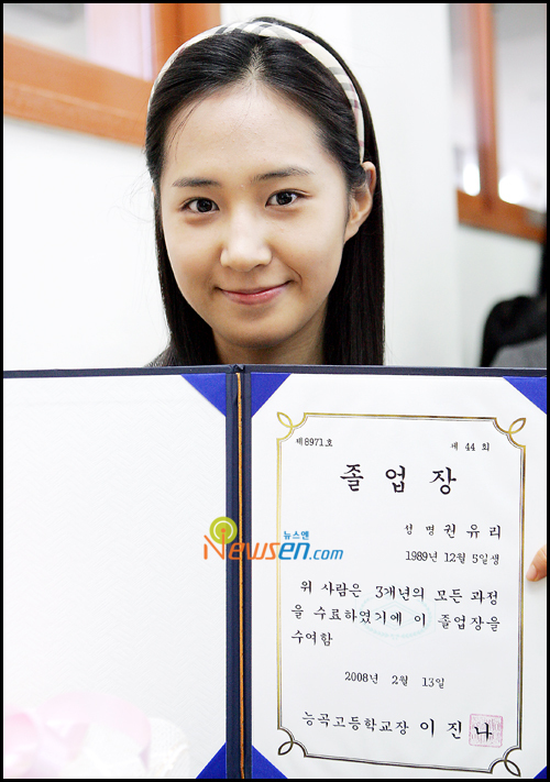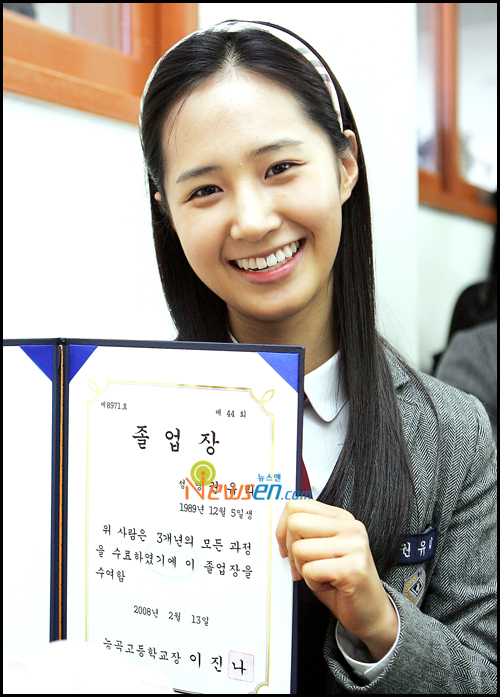 9人少女組合的成員侑莉於13號上午10點30分參加了在京畿道南陽市的nunggok高中舉行的 畢業典禮。 出生於1989年的侑莉正式脫離高中生的身份像成熟的少女邁進。另外,侑莉在此次高中畢 業的其他成員中是最後一個參加畢業典禮的。 今年除了侑莉外,成員泰妍、Jessica、Tiffany和Sunny等。 另外,少女時代第一張專輯的後續曲《Kissing You》也在各大排行榜上取得了極高的名次 。 From:TOM -- 以下是Yuri參加畢業典禮的新聞照XD