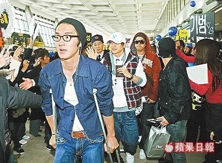 韓國人氣團體「Super Junior」成員崔始源(前)昨午拄柺杖離台,後為利特、強仁。林