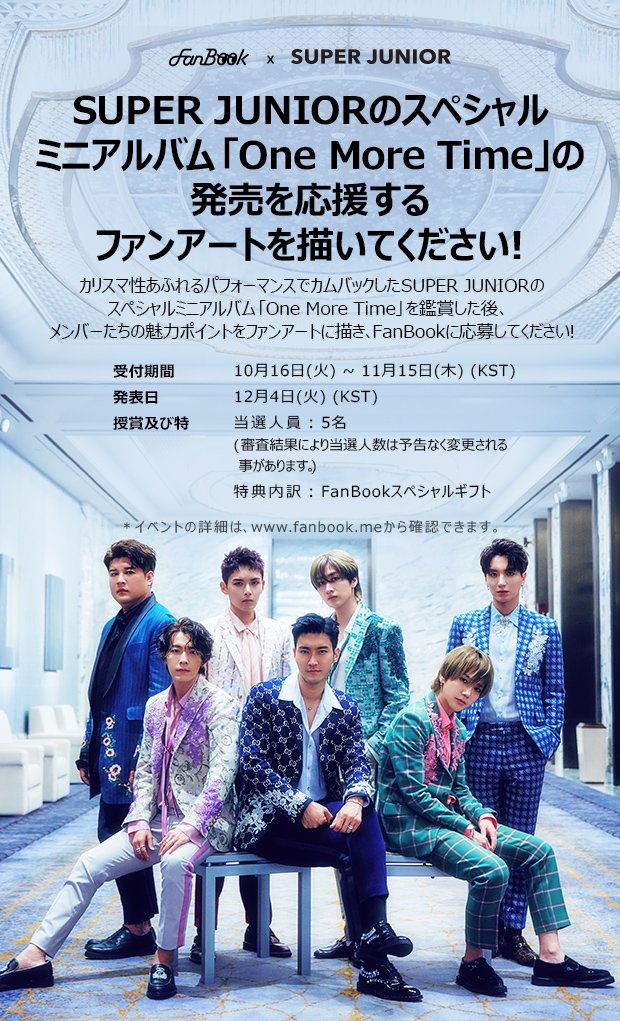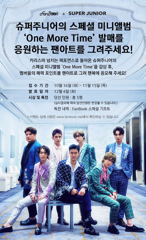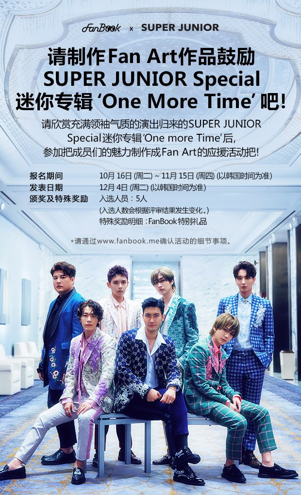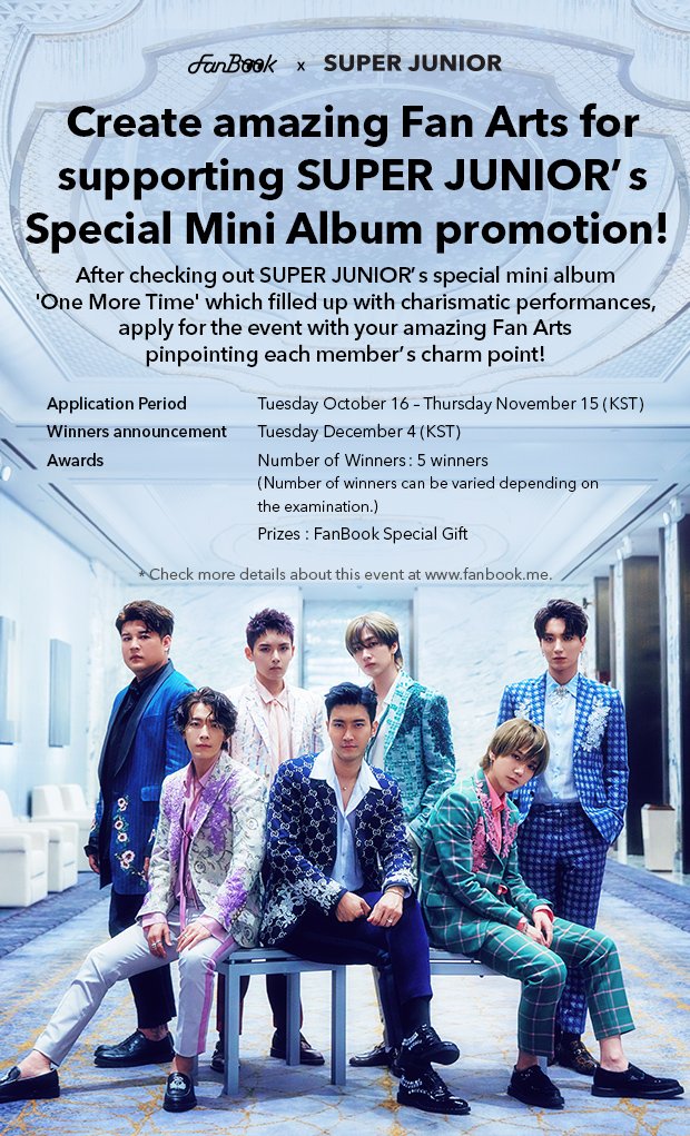 === 181016 === FanBook X SuperJunior EVENT 製作Fan Art作品鼓勵SUPER JUNIOR special 迷你專輯《#OneMoreTime#》吧! 請欣賞充滿領袖氣質的演出歸來的SUPER JUNIOR special 迷你專輯《One more Time》後 ,參加把成員們的魅力製作成Fan Art的應援活動吧! 詳情可通過 https://www.fanbook.me/event/detail/38 確認! [報名時間及日程] ‧ 報名期間: 10月 16日 (週二) ~ 11月 15日 (週四) (以韓國時間為準) ‧ 發佈日期: 12月 4日 (週二) (以韓國時間為準) [頒獎及特殊獎勵] ‧ 入選人員: 5人 ※ 入選人數會根據評審結果發生變化。 ‧ 特殊獎勵明細:FanBook特別禮品 [FanBook平台] ‧ Web: www.fanbook.me ‧ Mobile Google Play: https://play.google.com/store/apps/details?id=com.smtown.fanbook_android Apple Store: https://itunes.apple.com/kr/app/id1149315076 https://weibo.com/3064515967/GEccd8Umb https://pbs.twimg.com/media/DpmU3_OUYAAtm0l.jpg