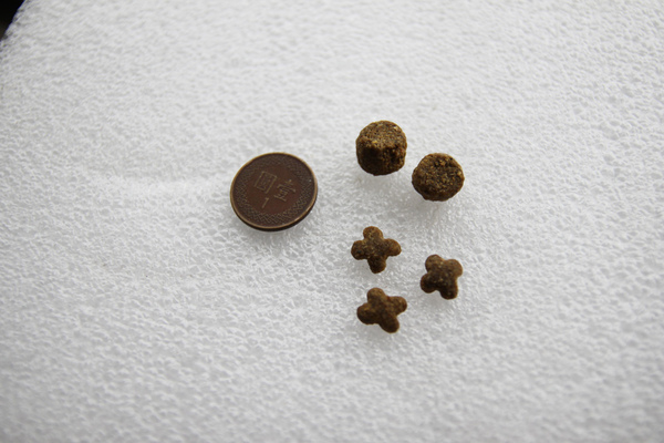 成犬飼料顆粒比較厚,小型犬飼料是幸運草狀,顆粒大小我覺得很適合