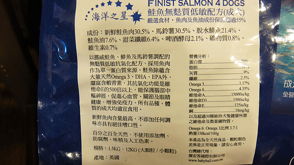 我們買的是成犬鮭魚無麩質低敏配方,大顆粒